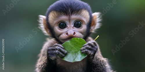 Obraz premium Young Monkey Holding Leaf in Forest