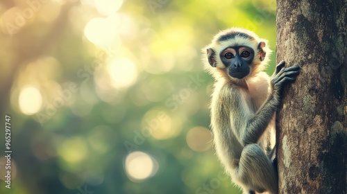 Obraz premium Young Monkey Looking at Camera While Climbing Tree.