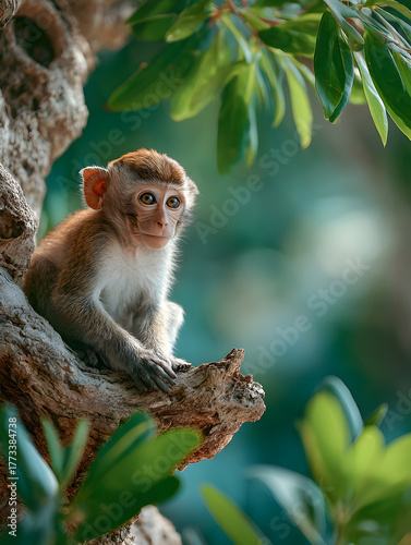 Fototapeta premium Young monkey sits perched on a branch amidst lush green foliage in a natural...