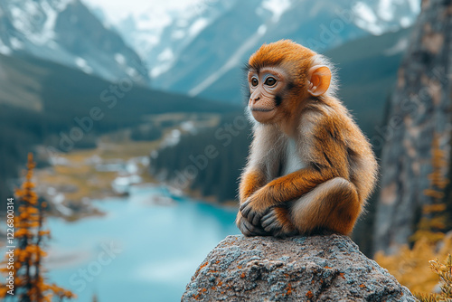 © Myartsam Design, Naklejka premium Young Monkey Sitting on Rock Mountain View