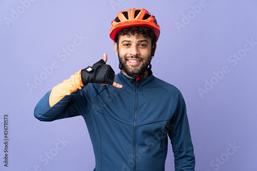 Fototapeta premium Young Moroccan cyclist man isolated on purple background making phone gesture. Call me back sign