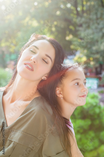 © luckyphoto, Fototapeta premium Young mother and daughter sitting back to back in nature in sunlight