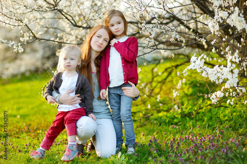 © MNStudio, Fototapeta premium Young mother and her children in blooming garden