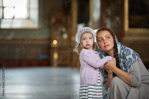 Naklejka premium Young mother and her little blond Caucasian daughter with candles in Orthodox...