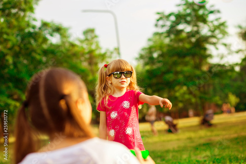 © Svetlana, Naklejka premium Young mother and little daughter playing in park with soap bubbles. Love family, parenthood, childhood