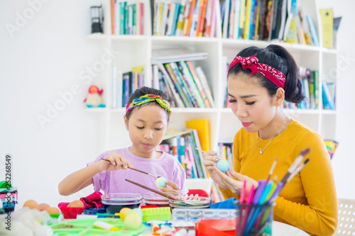 Naklejka premium Young mother colors Easter eggs with her daughter