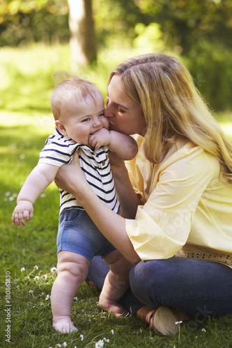 © Monkey Business, Fototapeta premium Young Mother Playing With Baby Son Outdoors In Summer Garden