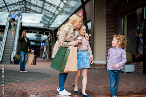 Naklejka premium young mother talking with her little kids during shopping at shopping centre