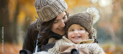 © Penatic Studio, Obraz premium Young mother with a small daughter in autumn nature at sunset on blur background.