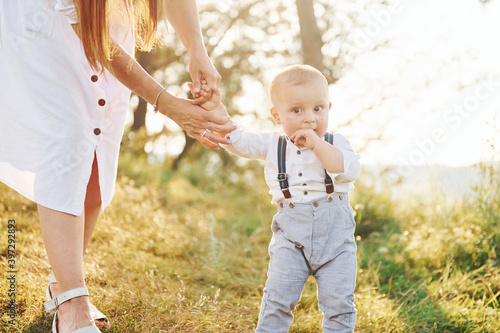 Fototapeta premium Young mother with her little son is outdoors in the forest. Beautiful sunshine
