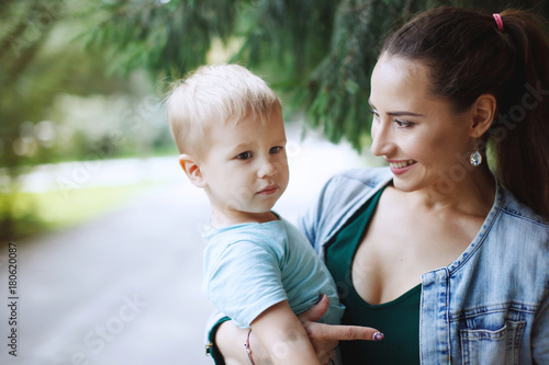 Fototapeta premium Young mother with little son having fun playing in the Park