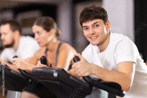 Obraz premium Young motivated guy training on an exercise bike in the gym