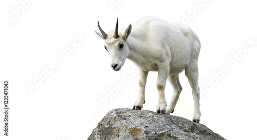 © budi, Naklejka premium Young Mountain Goat Kid Standing on a Rock Isolated on White Background