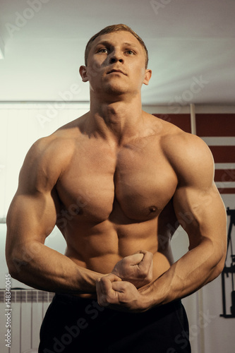 © semenenkostas, Fototapeta premium young muscular bodybuilder posing showing the biceps in the gym
