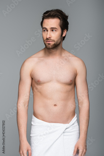 Fototapeta premium young muscular man in towel looking away isolated on grey.