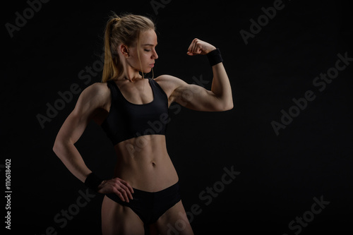 Obraz premium Young muscular woman posing on black