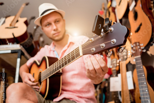 © romaset, Obraz premium Young musician tuning a classical guitar in a guitar shop