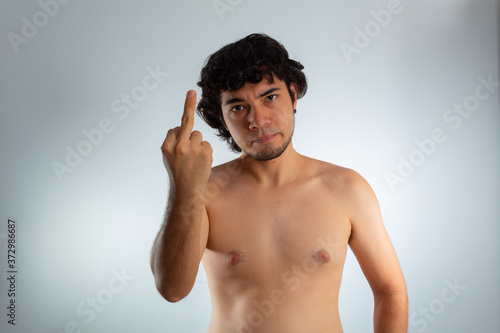 Fototapeta premium Young naked hispanic man with wavy hair and shaved beard, with angry expression, using the middle finger sign