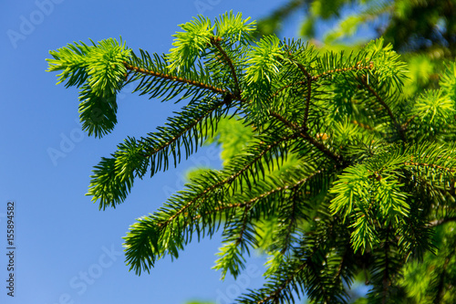 © olyasolodenko, Fototapeta premium Young needles on fir tree branches at spring