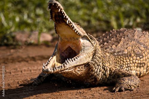 © robbyh, Obraz premium Young Nile Crocodile gaping while basking in the sun