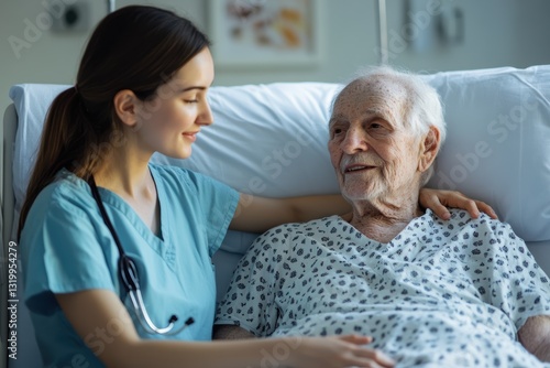 © Oleksandr, Obraz premium Young nurse provides comfort to elderly patient in hospital during daytime hours