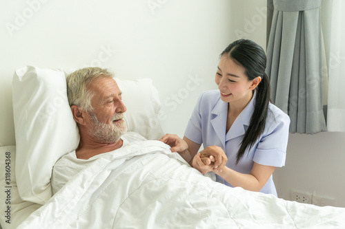 Obraz premium Young nurse take care senior man on a bed, A nurse checking sernior man, Senior man happniess and smiling with nurse, Health care concept