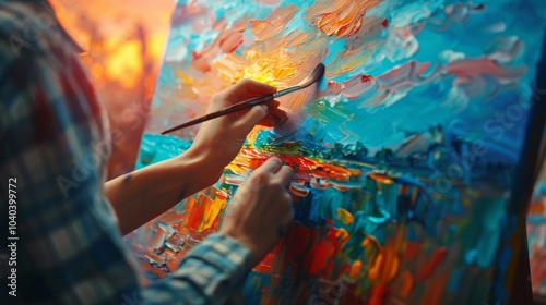 © Pat J., Obraz premium Young painter using vivid colors to create a sunset