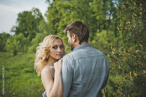 © alenazamotaeva, Fototapeta premium Young pair against a huge pine 3185.