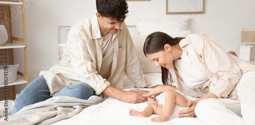 Obraz premium Young parents with their little baby in bedroom