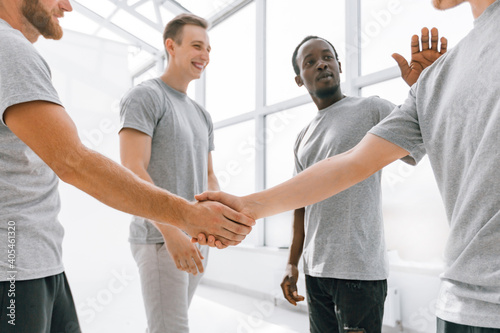 Obraz premium young participants of the business seminar shaking hands