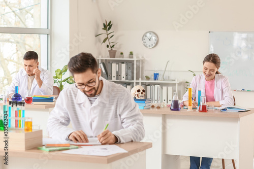 Obraz premium Young people at chemistry lesson in classroom