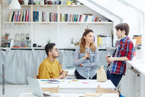 Obraz premium Young people brainstorming and talking while having snack and drinks