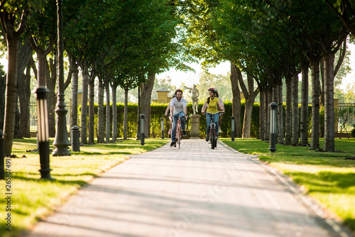 Fototapeta premium Young people cycling on road in park. Tourists on summer vacation. People and...