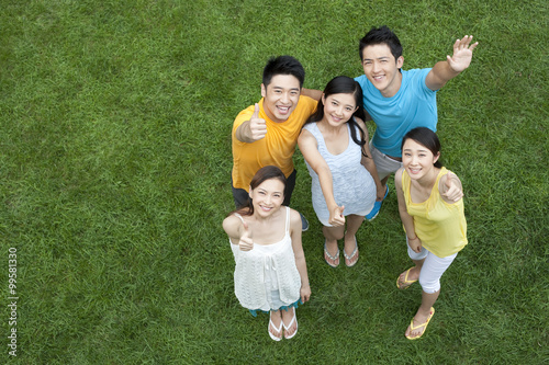 © Blue Jean Images, Fototapeta premium Young people doing thumbs-up on meadow