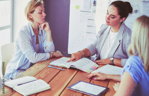 Fototapeta premium Young people studying with books on desk. Beautiful women and men working...