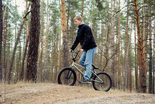 Fototapeta premium Young person on a BMX bike riding through a serene pine forest, capturing the spirit of outdoor adventure and youthful energy. Ideal for themes of nature, sport, and active lifestyle.
