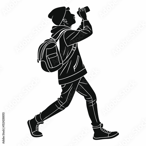 Fototapeta premium Young person with backpack taking photo silhouette