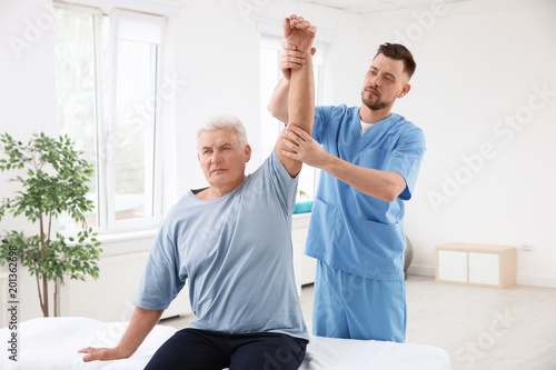 Obraz premium Young physiotherapist working with senior patient in clinic