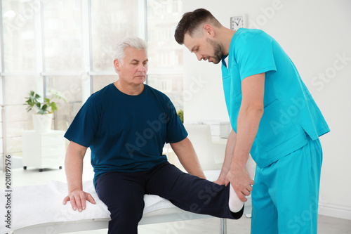 Obraz premium Young physiotherapist working with senior patient in clinic