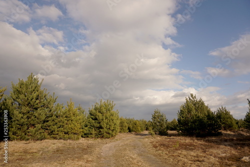 © taraskobryn, Obraz premium Young pine forest against the blue sky with clouds