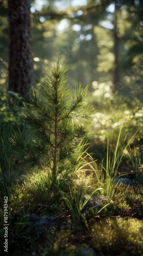 © iting, Fototapeta premium Young pine tree in forest sunlight nature scene for commercial use