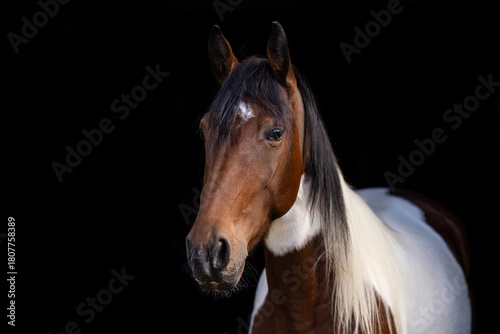 Obraz premium Young pinto gelding with brown and white coat standing against a dark background