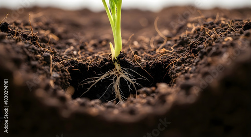 Fototapeta premium Young Plant Root System Anchoring in Fresh Soil – Early Growth and...