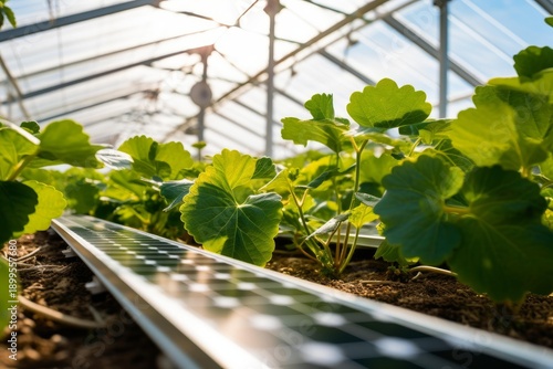 © nsit0108, Fototapeta premium Young plants growing near ground level solar panels inside a modern greenhouse