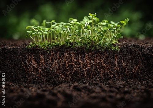 © zorandim75, Fototapeta premium Young plants growing with visible roots in rich soil