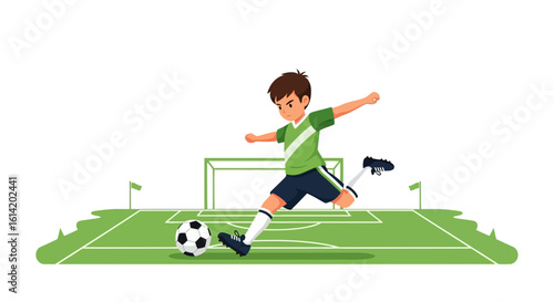 © Nayla, Fototapeta premium Young Player Kicking Soccer Ball Towards Goal on Grassy Field During Match