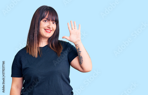 Fototapeta premium Young plus size woman wearing casual clothes showing and pointing up with fingers number five while smiling confident and happy.