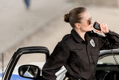 Fototapeta premium young policewoman in sunglasses talking on portable radio