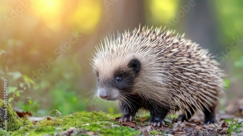 © sweet_mellow, Naklejka premium Young Porcupine Exploring Forest Floor In Natural Habitat. Wildlife And Nature Photography Capturing Animal Behavior