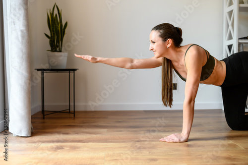 © Vadim Pastuh, Fototapeta premium Young positive woman is practicing yoga at home
